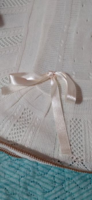 Preciosa toquilla de lana ,medidas 2 metros de largo por 84 cm de alto y 2 y medio perfecta para abrigar. - Color blanco. - Adornada con un lazo de cinta de raso. - Diseño calado con borde festoneado.