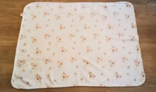 Manta con tacto muy agradable y acogedora para bebé con un adorable estampado de ositos y huellas. Ideal para usar como toquilla. Marca: Primark. Medidas: 100 cm (Ancho) x 78 cm (Largo).