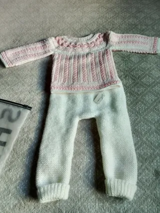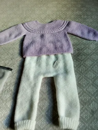 Chaqueta de bebé Artesanal y Nueva,en lana azul grisáceo degradado,botonadura de presion,o jersey lila o blanco combinado con perlé rosa.TALLA aproximadamente 3-6 meses.Si quieres más de un jersey o la chaqueta hablamos.Pantalon blanco con vuelta y cintura elástica,sin gomas.Acepto ofertas razonables