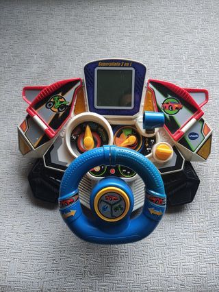 Volante interactivo Vtech Superpiloto 3 en 1. Totalmente funcional y sin partes rotas. - Pantalla digital. - Volante azul con detalles de coches y flechas. - Dos diales con indicadores. - Botones de colores y palanca. - Diseño inspirado en vehículos y carreras.