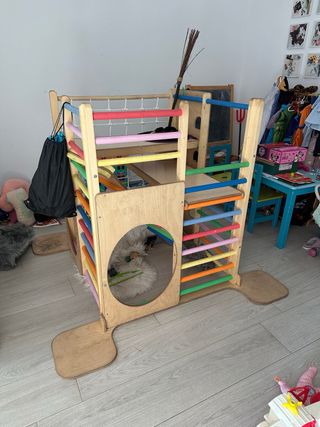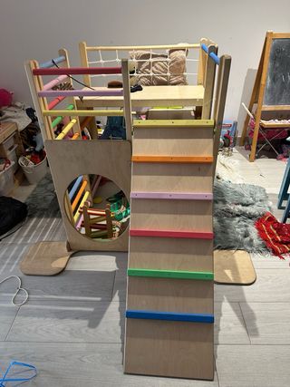Se vende parque de juegos interior de madera, ideal para el entretenimiento de los más pequeños. - Estructura de madera natural. - Barras de colores. - Incluye rampa y red.