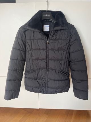 Anorak negro de la marca Mayoral. Entallado de la cintura. Con capucha y cuello de pelo sintético. Talla 14. 157cm - Color negro. - Cuello con pelo sintético. - Cierre de cremallera.