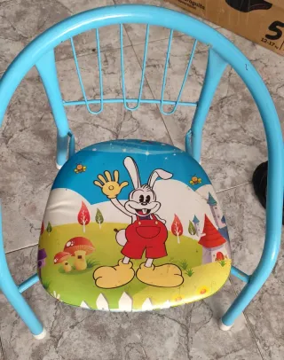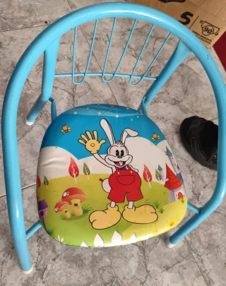 Silla de metal para niños pequeños con un divertido diseño. - Estructura de metal pintada en azul. - Asiento con estampado de un conejo y un castillo. - Ideal para habitaciones infantiles o zonas de juego. - tiene un rayon en la zona posterior del asiento