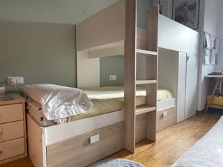 Litera con armario integrado y dos cajones. - Diseño moderno en madera clara y blanco. - Ideal para optimizar el espacio en habitaciones infantiles o juveniles.