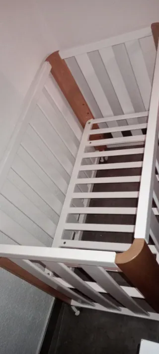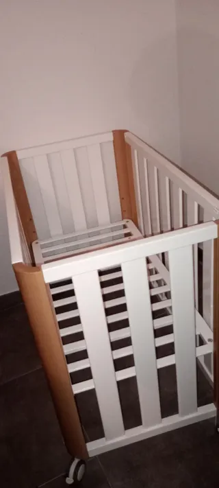 Cuna de bebé con un diseño moderno y funcional, combinando blanco y detalles en madera natural. - Estructura de madera lacada en blanco. - Laterales con barrotes. - Acabados en madera en las esquinas y bordes superiores.