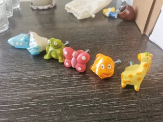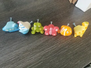 Conjunto de pomos infantiles con divertidos diseños. - Incluye un avión azul, un barco de vela, una rana verde, una mariposa rosa, un pez payaso y una jirafa amarilla. - Cada pomo tiene un diseño único y colorido. - Ideales para dar un toque divertido a muebles infantiles.