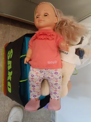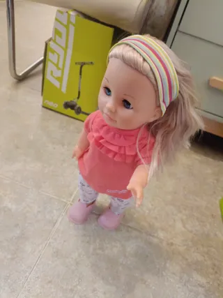 Muñeca Carmina Camina con ropa. - Camiseta rosa con volantes. - Pantalones estampados con flores. - Zapatos rosas. Funciona anda y habla