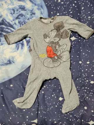 un pijama o mameluco de una sola pieza para bebé o niño pequeño, extendido sobre una colcha. Color: gris claro. Talla: 12 Meses. Diseño: un Mickey Mouse grande en la parte frontal, con Mickey usando pantalones cortos rojos Estilo: manga larga y piernas largas Cierre: broches en el cuello, típicos de la ropa para bebé El material parece ser algodón o una mezcla de algodón, suave y adecuado para dormir o estar en casa