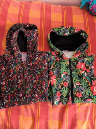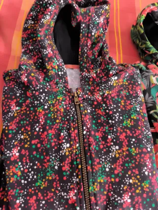 Lote de dos sudaderas de la marca Boboli para niña. - Sudadera con estampado floral y salpicaduras de colores sobre fondo negro. - Sudadera con estampado tropical de hojas, flores y tucanes. Precio x las 2