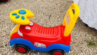Divertido coche correpasillos para los más pequeños. Ideal para jugar en interiores y exteriores. - Diseño colorido en rojo, azul y amarillo. - Volante con botones. - Asa para empujar.