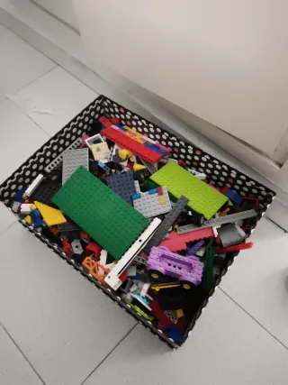 Caja surtida con piezas de construcción LEGO. - Variedad de bloques y accesorios. - Piezas de diferentes colores y tamaños.