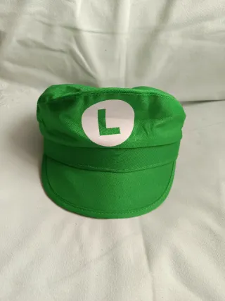 Gorra de ropa del personaje Luigi, de color verde. Tipo de gorra de plato. Tiene alguna mancha a causa de su uso. La gorra no tiene etiqueta de talla pero la medida del contorno de la gorra és de 54 cm.