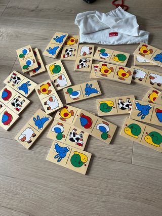 Divertido juego de dominó de madera con simpáticos animales de granja. - Piezas de madera. - Ilustraciones de animales. - Ideal para niños de 1 a 3 años. -Seguro para niños tan pequeños -Incluye la bolsa de tela original