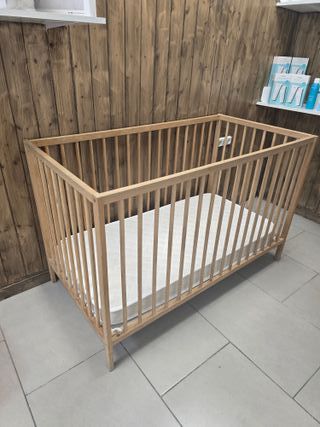 Cuna de madera clara, ideal para habitaciones infantiles. Su diseño sencillo y funcional se adapta a cualquier estilo. - Estructura de madera. - colchón incluido