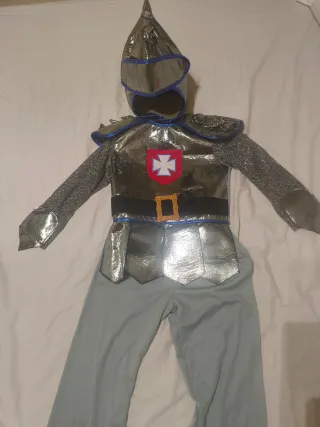 Disfraz de caballero para niños, ideal para fiestas o juegos. 6-8 años - Incluye casco con detalles plateados y borde azul. - Peto con diseño de armadura y escudo blanco con cruz roja. - Cinturón negro con hebilla dorada. - Mangas y parte superior del pecho imitando malla. - Pantalones grises. - Falda de armadura en la cintura.