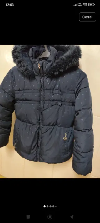 Abrigo de invierno para niña, de color azul marino con un discreto estampado de corazones. - Capucha con pelo sintético. - Cierre de cremallera. - Detalle de lazos en los bolsillos. - Adorno de corazón en el bolsillo.
