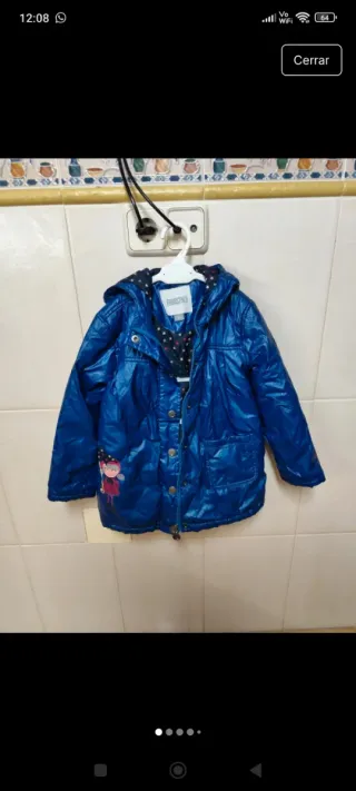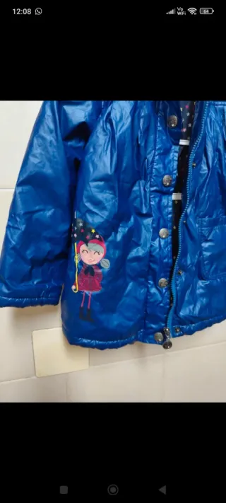Chaqueta de invierno para niña, color azul brillante. - Con capucha forrada. - Estampado interior de estrellas. - Detalle de personaje en la parte delantera. - Cierre de botones.