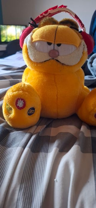 Peluche del personaje Garfield, con una diadema roja y blanca. - Material de felpa suave. - Diseño colorido y divertido. Tiene un desperfecto en la diadema