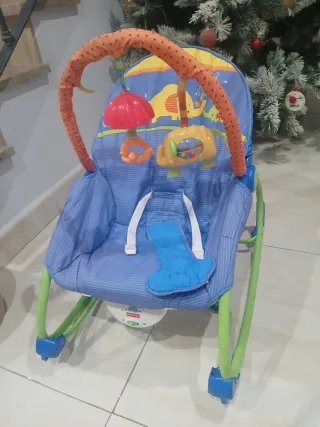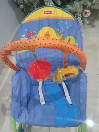 Hamaca vibratoria para bebés de la marca Fisher-Price. Ideal para relajar y entretener a los más pequeños. . Tiene vibración. Regalo pilas - Diseño con estampado de elefantes. - Barra de juegos con juguetes colgantes. - Cinturón de seguridad de 3 puntos. - Patas con sistema de balanceo. Solo le falta un muñeco pero se le puede pegar uno al velcro.por lo demás esta perfecta
