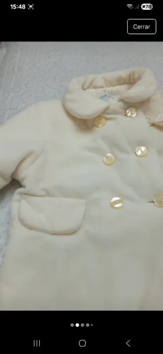 Abrigo de bebé para niña en color crema. Es un abrigo de doble botonadura con cuello - Dos bolsillos delanteros. - Cuatro botones decorativos en la parte delantera. Costo 90 euros.