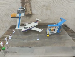 Conjunto de Playmobil para recrear un aeropuerto con torre de control y avión. - Incluye torre de control con detalles. - Avión de pasajeros jet privado blanco con detalles azules y rojos. Referencia Playmobil 70533 - Terminal de aeropuerto con escaleras y figuras. Referencia Playmobil 5338 - Señales de tráfico para la pista. No son originales Playmobil. No están completas. Solo lo que sale en las fotos. Se adjunta captura de las referencias a las que corresponde. Hago envíos.