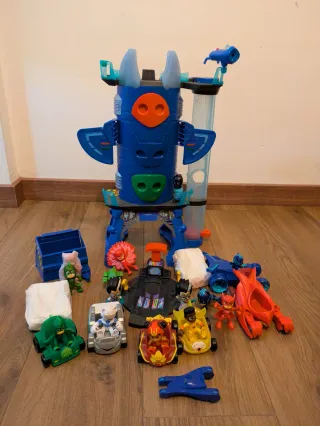 Set de juego de la base de control de PJ Masks con varios vehículos y personajes. - Base de control azul con detalles de alas y cara. - Incluye varios coches de personajes. - Varios personajes de PJ Masks.