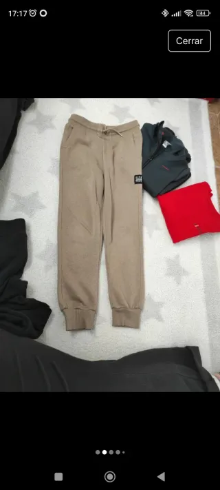 Lote formado por 2 pantalones y 2 sudaderas de niño, talla 7-8. Todo está usado pero con posibilidades, para tardes de parque o estar por casa calentito. Las etiquetas muestran que las prendas han sido usadas poco tiempo, están intactas. Quechua, Lefties y marca local. Conjunto de ropa para niño en talla 7-8 años. Incluye varias prendas. - Sudadera gris con cremallera. - Camiseta roja. - Pantalón beige. - Pantalón negro.
