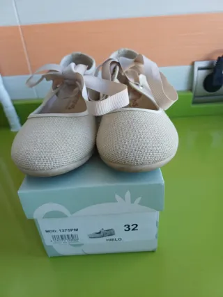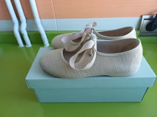 Preciosas pisamonas para niña en talla 32. - Color beige. - Cierre con lazo. - Material de lino.