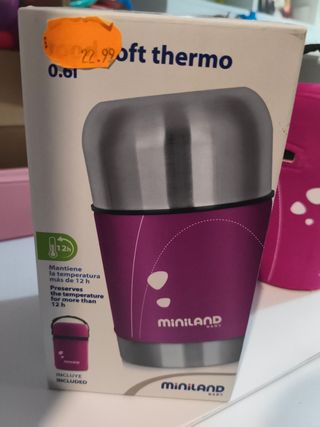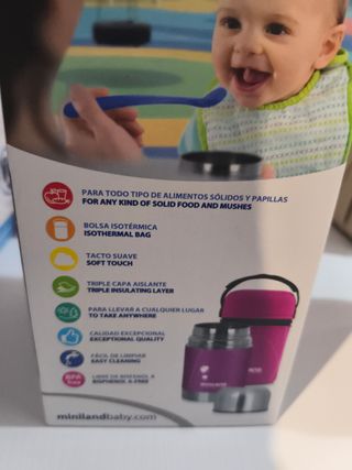 Termo infantil de la marca Miniland, ideal para mantener la comida caliente o fría. - Capacidad de 0.6L. - Color morado. - Incluye funda de transporte. No usado