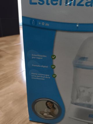Esterilizador digital ergonómico para biberones. - Esterilización por vapor. - Pantalla digital. - Alerta sonora de finalización. - Capacidad para 6 biberones. La parte de la placa está algo más desgstads por el agua caliente pero va genial.