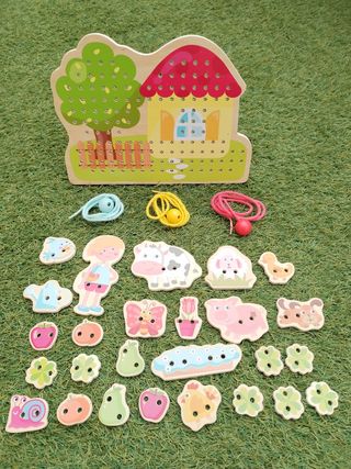Juego compuesto por una casa de madera (2D) con perforaciones para poder pasar cuerdas a través de ella y así sujetar figuras y accesorios de madera. Con todas sus piezas.