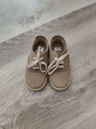 Preciosos zapatos para bebé de la marca Psam. Ideales para los primeros pasos. - Son de color beige claro. - Están hechos de lona. - Tienen cordones. - La suela es de yute. - Se encuentran en muy buen estado.