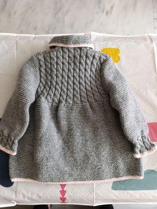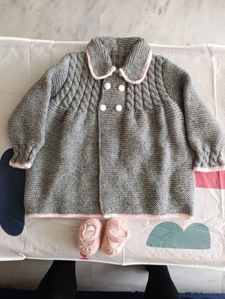 Precioso abrigo tejido a mano para bebé, color gris con detalles en rosa. Es una prenda delicada y suave, ideal para mantener a tu pequeño abrigado con estilo. - Tejido a mano con lana suave. - Diseño de punto trenzado en la espalda. - Cierre con botones. - Incluye un par de escarpines a juego.