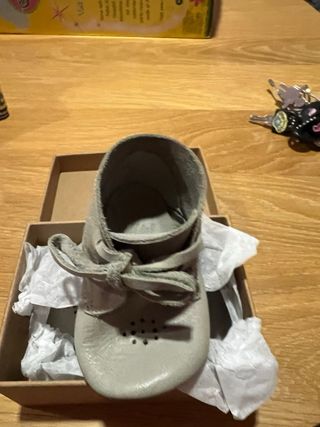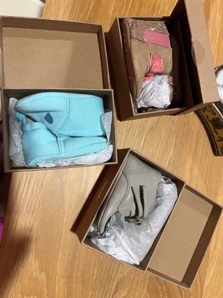 Conjunto de tres pares de zapatos para bebé o muñeco. - Un par de zapatos en color azul claro. - Un par de zapatos en color beige con estampado. - Un par de botines en color gris. uno 10€ los tres 25€