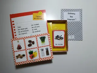 Divertido juego educativo en francés inspirado en el bingo que facilita el aprendizaje, el refuerzo y el uso correcto del vocabulario relacionado con la cocina tradicional francesa y las estructuras de compra favoreciendo la memorización del vocabulario de comida y bebida, así como las estructuras lingüísticas de compra y venta.