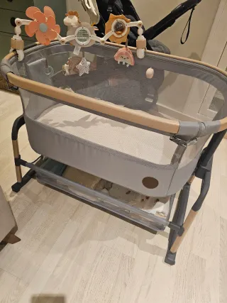 Minicuna colecho Maxi-Cosi Iora Air Beyond Grey gris con un diseño moderno y funcional. Perfecta para tener al bebé cerca. - Laterales de malla transpirable. - Estructura de madera y metal. - Incluye cesta inferior de almacenamiento. - Colchón cómodo y suave. - Balancín. - Incluye arco de juguetes y sábana bajera. Se vende porque la niña hace colecho con nosotros en la cama desde recién nacida.