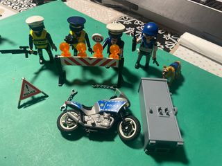 Set de Playmobil con figuras de policías y accesorios. - Incluye figuras de policías con uniformes y cascos. - Cuenta con una moto de policía detallada.falta manillar - Varios accesorios como barrera, conos y un perro policía. - También incluye un maletín o caja gris.