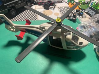 Helicóptero de policía de Playmobil. - Diseño blanco con detalles azules y rojos. - Hélices principales y de cola. - Cabina con ventanas transparentes.