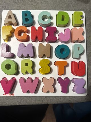 Juguete educativo de madera con las letras del abecedario. - Marca Janod. - Piezas de madera con colores variados. - Diseño de encaje para cada letra.