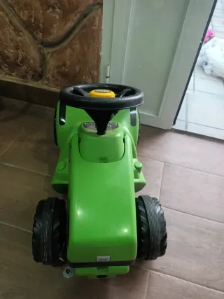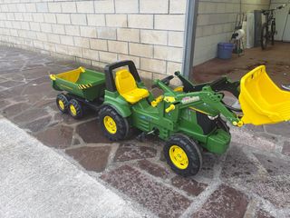 Tractor a pedales de la marca John Deere, ideal para los más pequeños. Incluye un remolque. - Diseño inspirado en el tractor John Deer.e. - Ruedas resistentes. - Volante para dirigir. Se ha usado 4 o 5 veces y costó nuevo el tractor 189 euros y el remolque 65 euros.Ruedas de goma irrompible que no tiene nada que ver con las de plásticos.