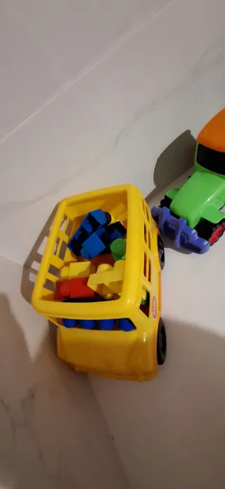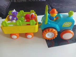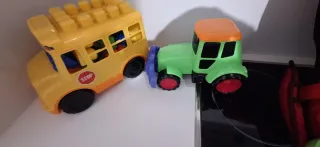 Incluye lo que se ve en las fotos: - Tractor con remolque (con pilas hace ruidos ) - Autobús con piezas con diferentes formas. - Volante de juguete. Con pilas hace ruidos de coche.