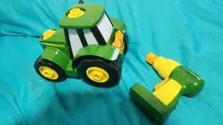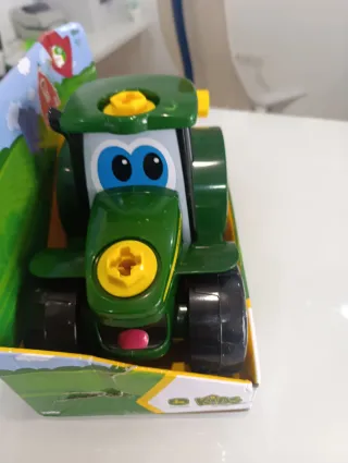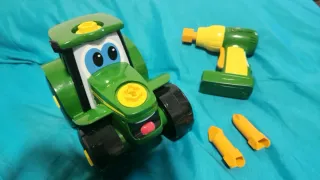 Juguete de John Deere "Yo construyo mi tractor Johnny" de Tomy. Este kit educativo permite a los niños desmontar y volver a montar el tractor utilizando un destornillador electrónico seguro incluido. El conjunto consta de un total de 15 piezas, incluyendo el cuerpo del tractor, las ruedas y los tornillos amarillos que son fáciles de manejar. Está diseñado para que los niños a partir de 18 meses desarrollen habilidades motoras finas.