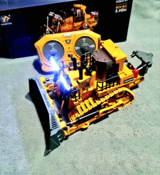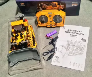 Juguete de tractor tipo oruga con control remoto. - Modelo: Track-Type Tractor - Canales: 9CH - Frecuencia: 2.4GHz - Pala y gancho de metal - Pala funcional controlado por el mando - Luces y sonido controlado por el mando - Incluye control remoto, batería, cargador y destornillador.