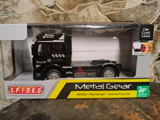 Camión de juguete de la marca SPIDKO, modelo Metal Gear. - Color negro. - Fabricado en metal fundido (Die Cast Metal). - Diseño de tractor. - Incluye detalles como SUPER TRUCK y TRUCK en el lateral.