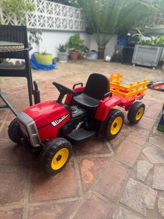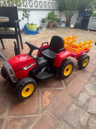 Tractor infantil a batería, perfecto para que los más pequeños disfruten al aire libre. Lo puede conducir el propio niño desde el tractor o con mando de radiocontrol . -Tiene velocidades y marcha atras - Luces y música -Bateria en buen estado. - Incluye remolque - Asiento amplio con cinturón de seguridad