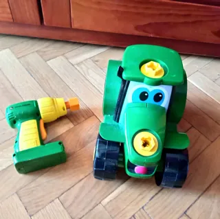 Tractor de juguete infantil de la marca John Deere, ideal para los más pequeños. Este tractor es desmontable y viene con un taladro y dos terminales para adaptarlo a las piezas del tractor. - Diseño divertido y colorido. - Piezas fáciles de manipular. - Está prácticamente como nuevo