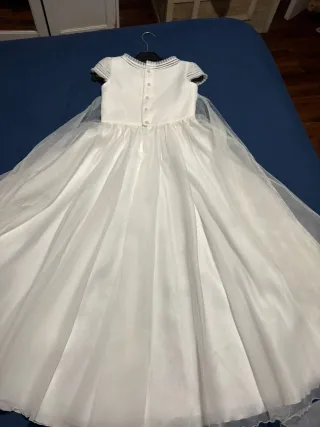 Vestido de Comunión Blanco. Un sólo uso. Con Tul transparente y traje forro debajo. Abotonado a la espalda. Incluye gorro casquete con velo.