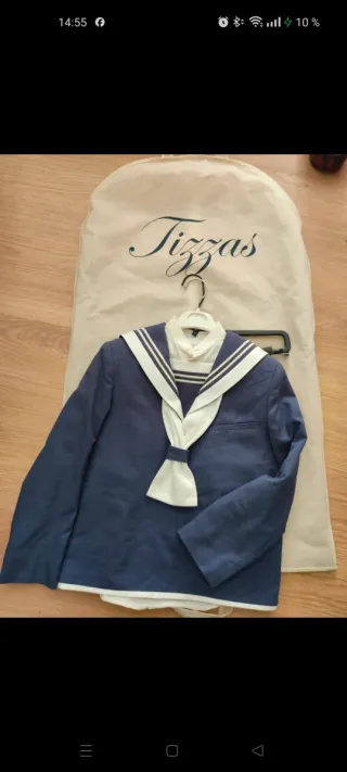 Traje de comunión de niño con diseño marinero de la marca Tizzas. Incluye chaqueta y pantalón. REGALO FUNDA -Solo está para llevar a la tintorería de una solo puesta, pero de estar guardado. No está modificado nada por costurera Pedir medidas sin compromiso - Diseño marinero. - Marca: Tizzas.