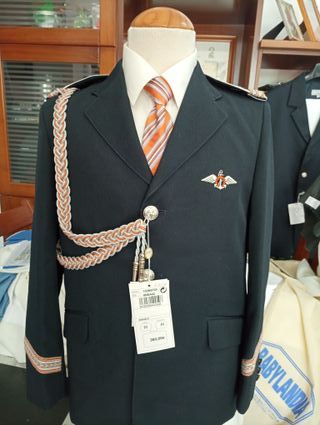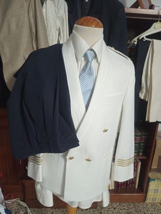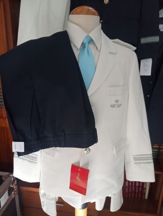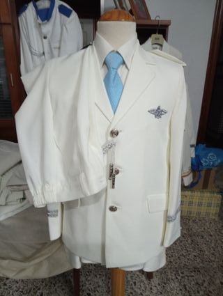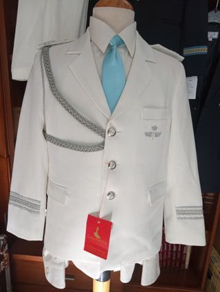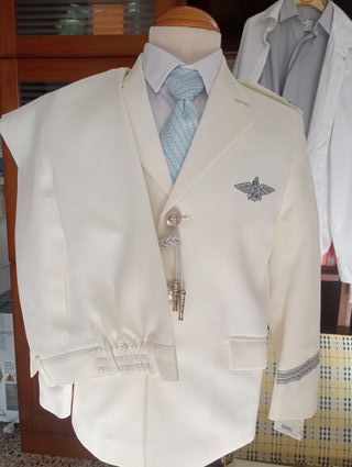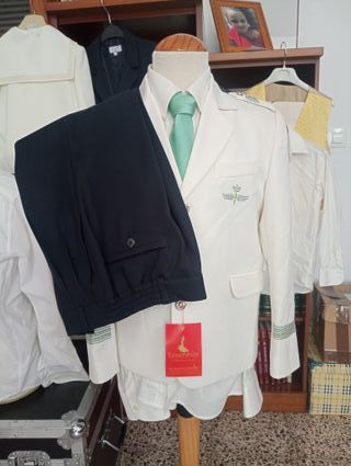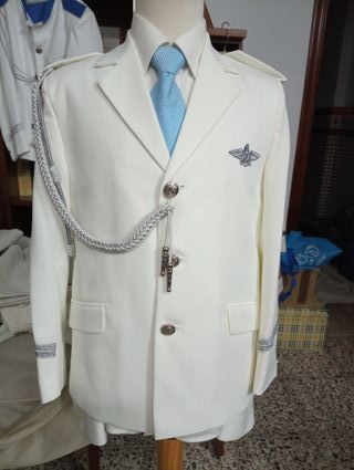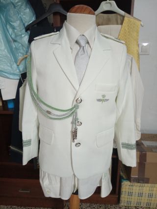 - NUEVO A ESTRENAR - Traje de comunión para niño, talla 11. Ideal para una ocasión especial. - Chaqueta y pantalon azul marino con detalles bordados en cuello y puños. - Cordones decorativos en verde y blanco. - Insignia con alas en el pecho. - Botones plateados. - Fabricado en España.