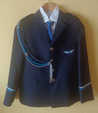 Conjunto de traje de almirante en color azul marino, para comunión. - Chaqueta de doble abotonadura con detalles dorados. - Chaleco a juego. - Adornos dorados en hombros y puños. - Insignia de aviación en la solapa. La camisa no se incluye.
